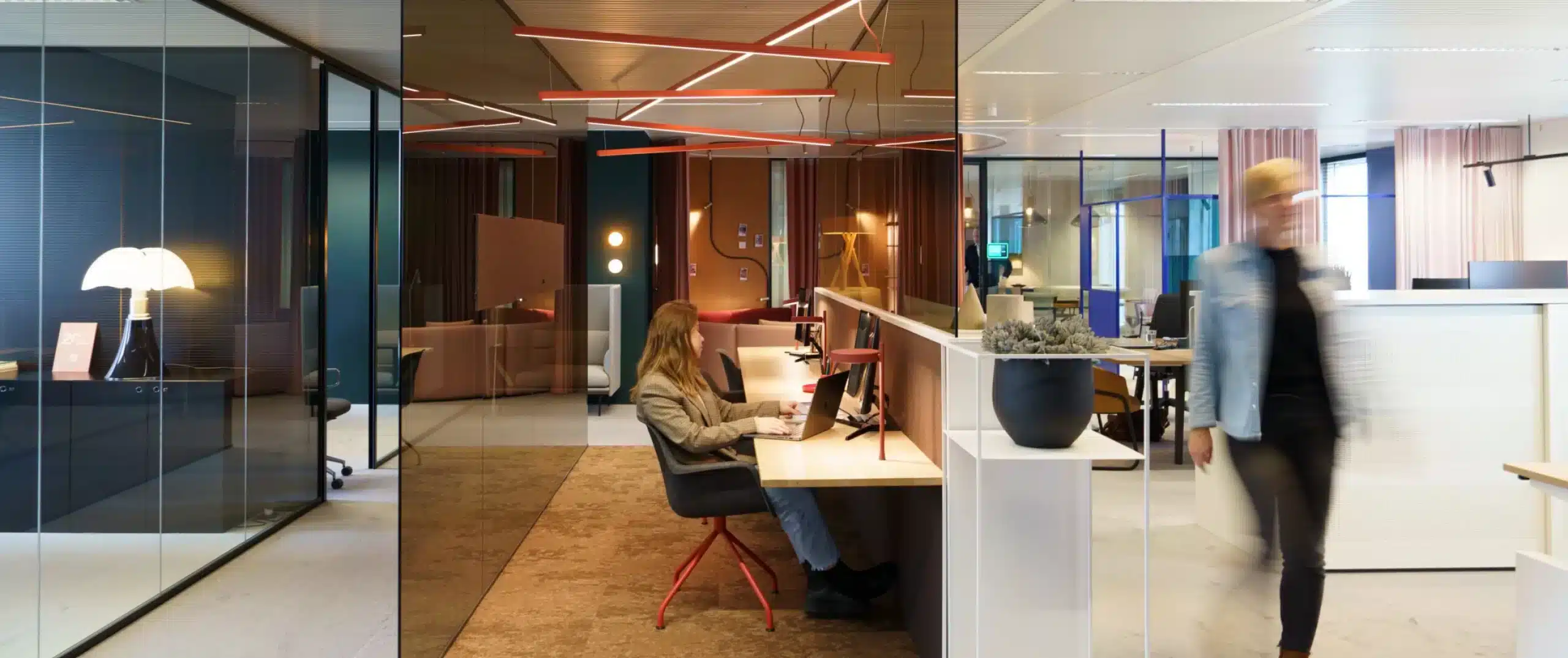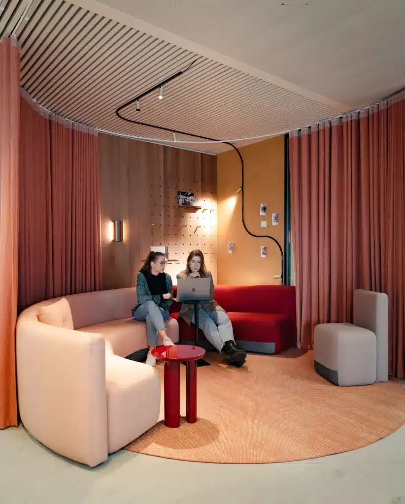 Sara: “Wil je een kantoorinrichting die de tand des tijds doorstaat? Blijf dan zoveel mogelijk weg van modegrillen. Zeker voor vaste interieurelementen, zoals vloerbekleding, maatkasten en wandpanelen. Kies voor een sobere en functionele basis, bijvoorbeeld in hout, staal of beton, aangevuld met zachte kleuren zoals wit, beige en bruin.