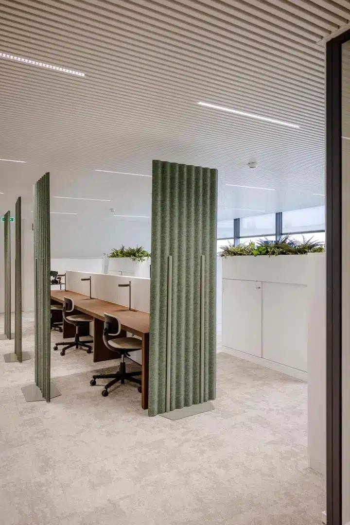 Bij onze inrichting voor Cronos aan de Leie werkten we met een combinatie van hangplanten en grote potplanten. Die mix zorgt niet alleen voor sfeer, maar ook voor natuurlijke afscheiding, betere akoestiek en zuurstofrijke lucht.