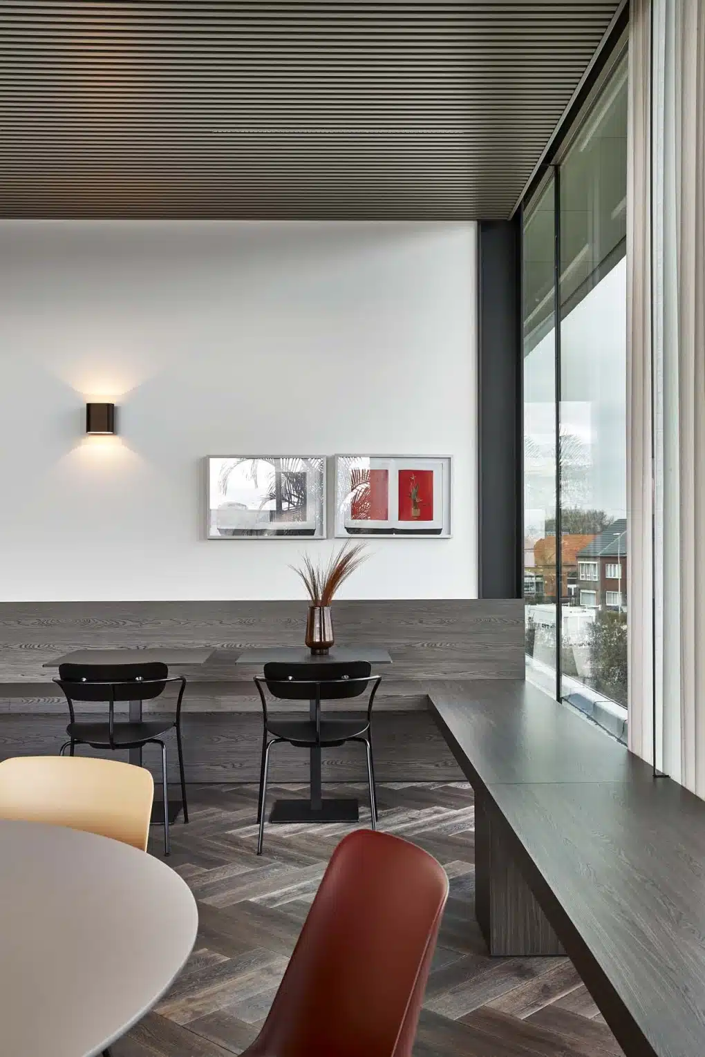 Bij Cronos aan de Leie werd de openheid van de ruimte bewust behouden. Dankzij de grote raampartijen, open kasten en het gebruik van hangplanten blijft het uitzicht luchtig.