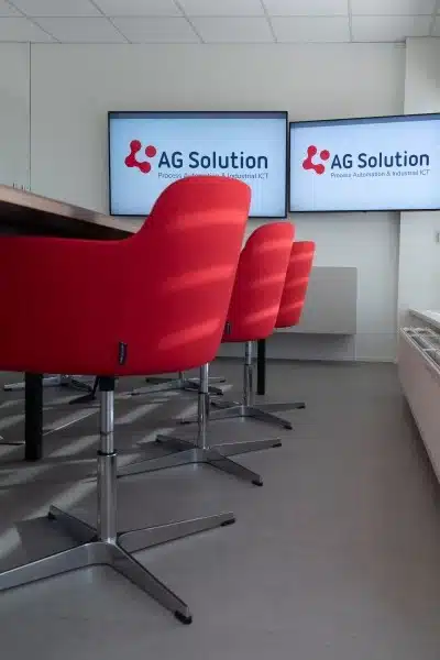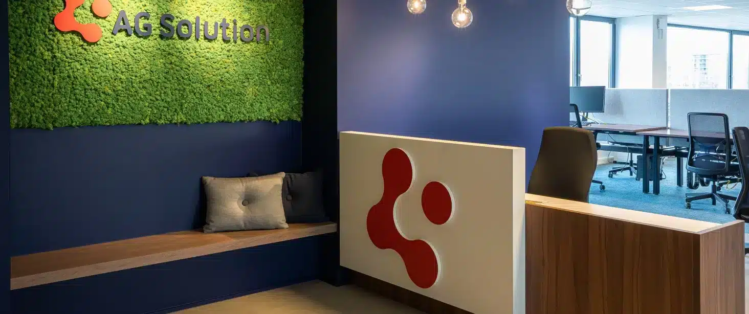 Om de nieuwe huisstijl volledig uit te dragen, hebben we het kantoorontwerp van AG Solution tot in de details verfijnd. Voor deze grote speler, die intelligente oplossingen bouwt over heel Europa, gingen we zelfs over de landsgrenzen heen. Het kantoor in Antwerpen stond als eerste op onze lijst waarna Barcelona en Madrid al snel volgden.