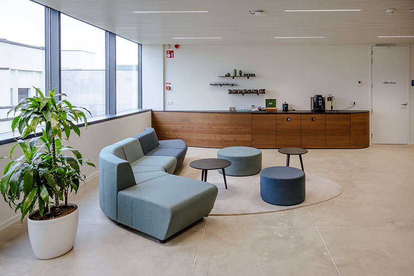 Het gebouw werd ontworpen door Derveaux Architecten, met oog voor licht, openheid en beleving. Wij vertaalden die architecturale visie naar een inrichting die aanvoelt als thuiskomen. Glazen wanden en organisch gevormde verlichting zorgen voor een lichte, open sfeer. Warme materialen zoals hout, tapijt en textiel brengen comfort en een aangename akoestiek. De blauwgrijze tinten en afgeronde vormen houden het geheel sereen en professioneel, een plek waar je graag bent, en nog liever werkt.