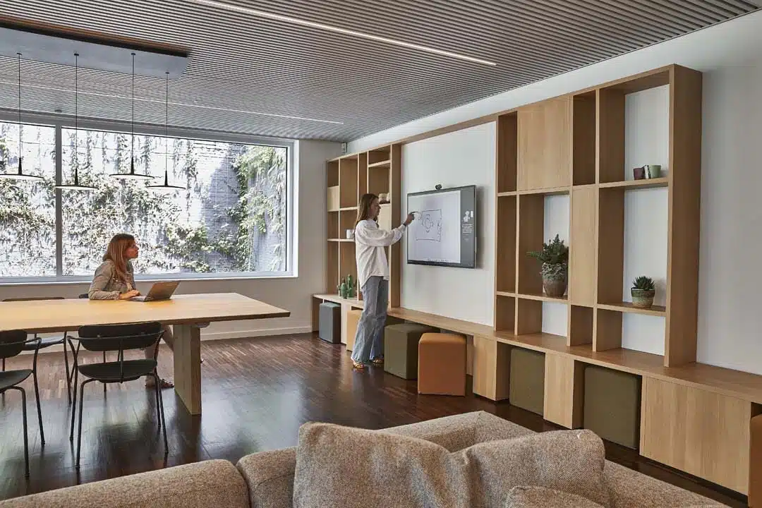 Onder andere de grote, ambachtelijke werktafel in de living is een succesverhaal. “Buro Project nam ons mee naar een schrijnwerker in de buurt om het hout en de afwerking te kiezen. Die tafel is nu dé hotspot voor directiemeetings, teamlunches en co-working”, vertelt Bart. “Iedereen voelt zich hier thuis. We beseffen meer dan ooit dat een werkomgeving een vertaling moet zijn van wie je bent en hoe je wil groeien als organisatie”, besluit hij.