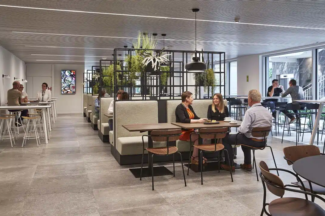 “De inrichting van de ruimtes geeft meteen prijs welk doel ze dienen”, vertelt Maaike Vandenbroeck, Sales Manager bij Buro Project. “Zo zien de twee restaurants – eentje voor een snelle hap en een ander voor uitgebreide zakenlunches – er verschillend en toch harmonieus uit. We zijn erin geslaagd om meerdere sferen te creëren binnen het overkoepelend concept.” Dat ontgaat ook de werknemers niet. Julie Devers, Aankoper bij Argenta: “Door de diversiteit in het ontwerp is er nu voor elk soort ontmoeting een perfecte plek.”