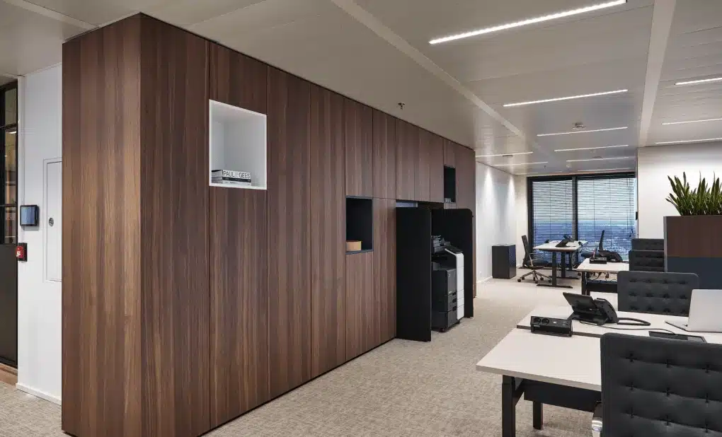 Bij het ontwerpen van de kantoorinrichting lieten we ons inspireren door het natuurlijke licht en het panoramische zicht over Brussel. Door te kiezen voor een mix van natuurlijke materialen, zachte tinten en industriële afwerkingen, creëerden we een rustgevende, moderne uitstraling die aansluit bij het karakter van Astanor. Centraal in de ruimte bevindt zich een verhoogde sky lounge – een echte eyecatcher die niet alleen visueel verbindt, maar ook zorgt voor spontane interactie. Daaromheen: vergaderruimtes, afgesloten kantoren en open werkplekken die efficiënt samenwerken én afzonderen mogelijk maken.