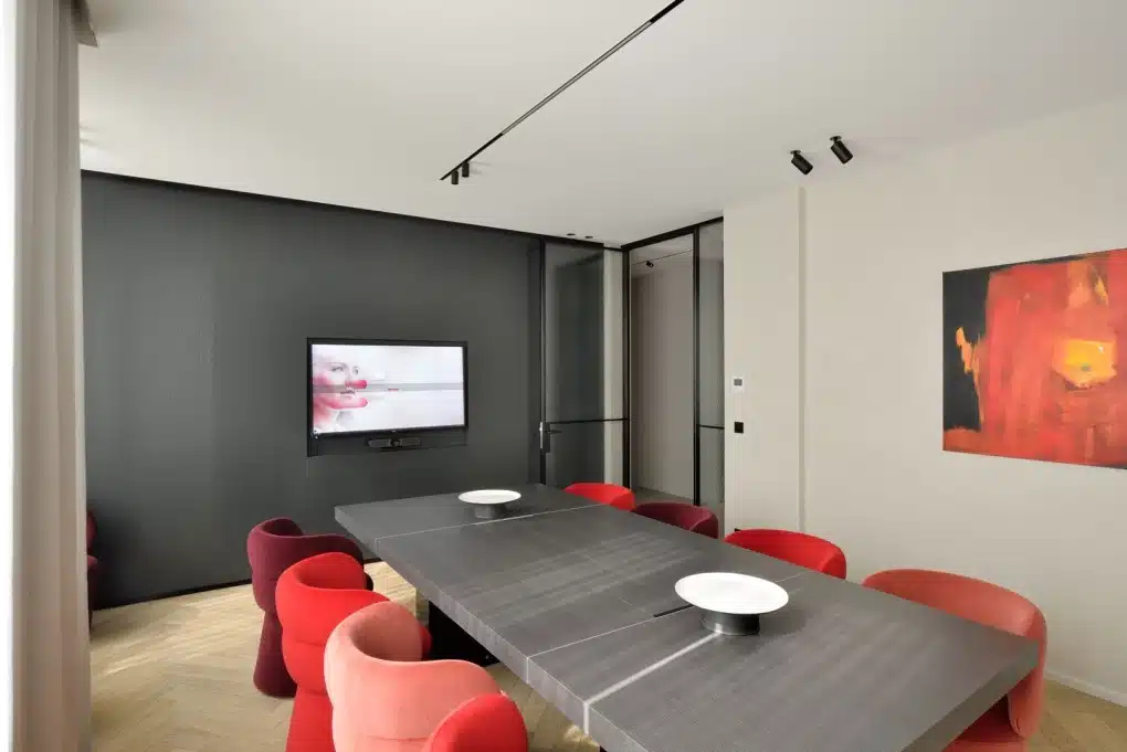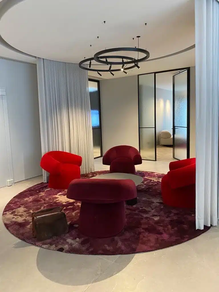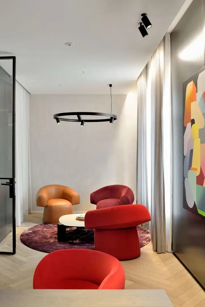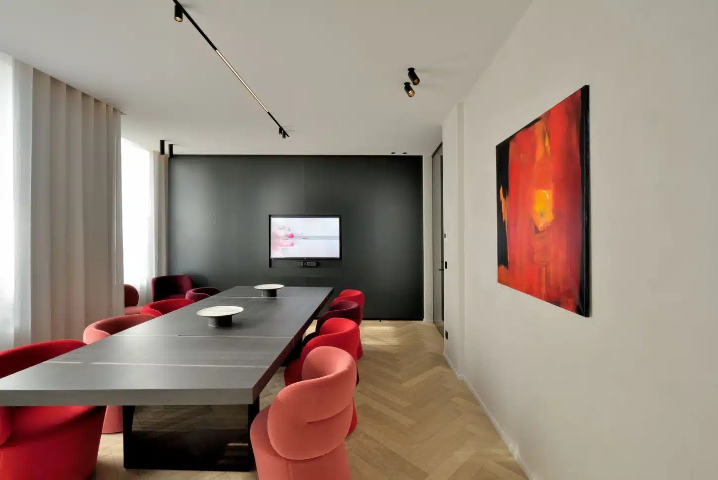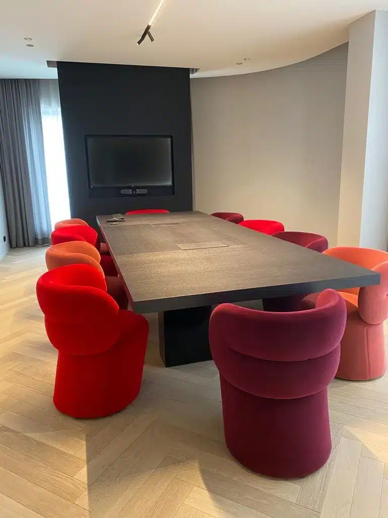 Het meubilair in de Belfius Private kantoren is niet alleen comfortabel en kwalitatief, maar ook doordacht gekozen op basis van de merkidentiteit van Belfius. We voorzien zachte, afgeronde zetels in rijke stoffen in een combinatie van het herkenbare Belfius-rood met bijpassende schakeringen en diepe zwarte accenten. Die kleurencombinatie sluit perfect aan bij de huisstijl, en straalt tegelijk warmte en klasse uit. De materialen zijn tactiel en uitnodigend. Je voelt dat hier over nagedacht is: klanten moeten zich welkom voelen, op hun gemak, en met vertrouwen ontvangen worden. De inrichting draagt daar zichtbaar en onzichtbaar aan bij.