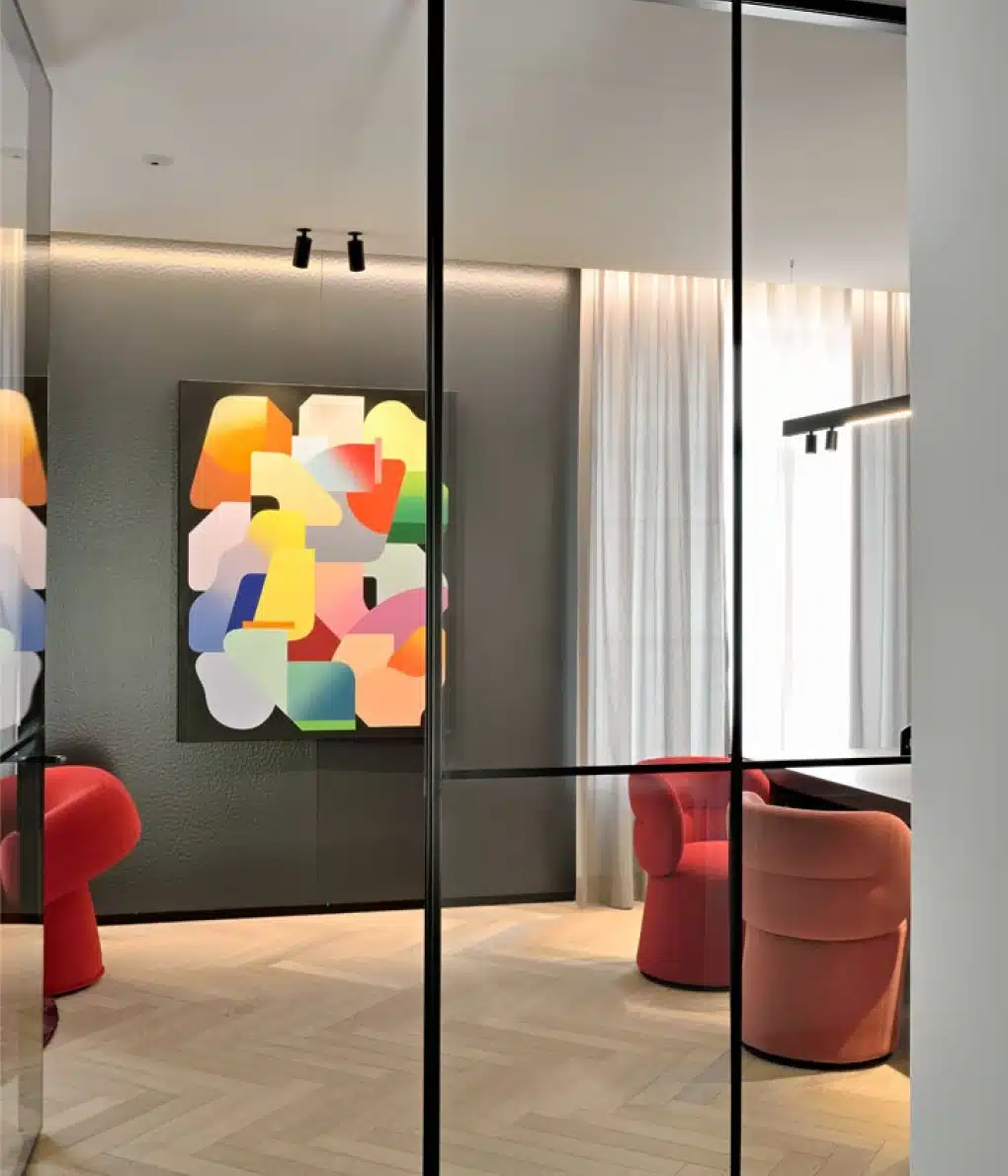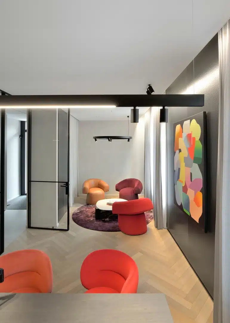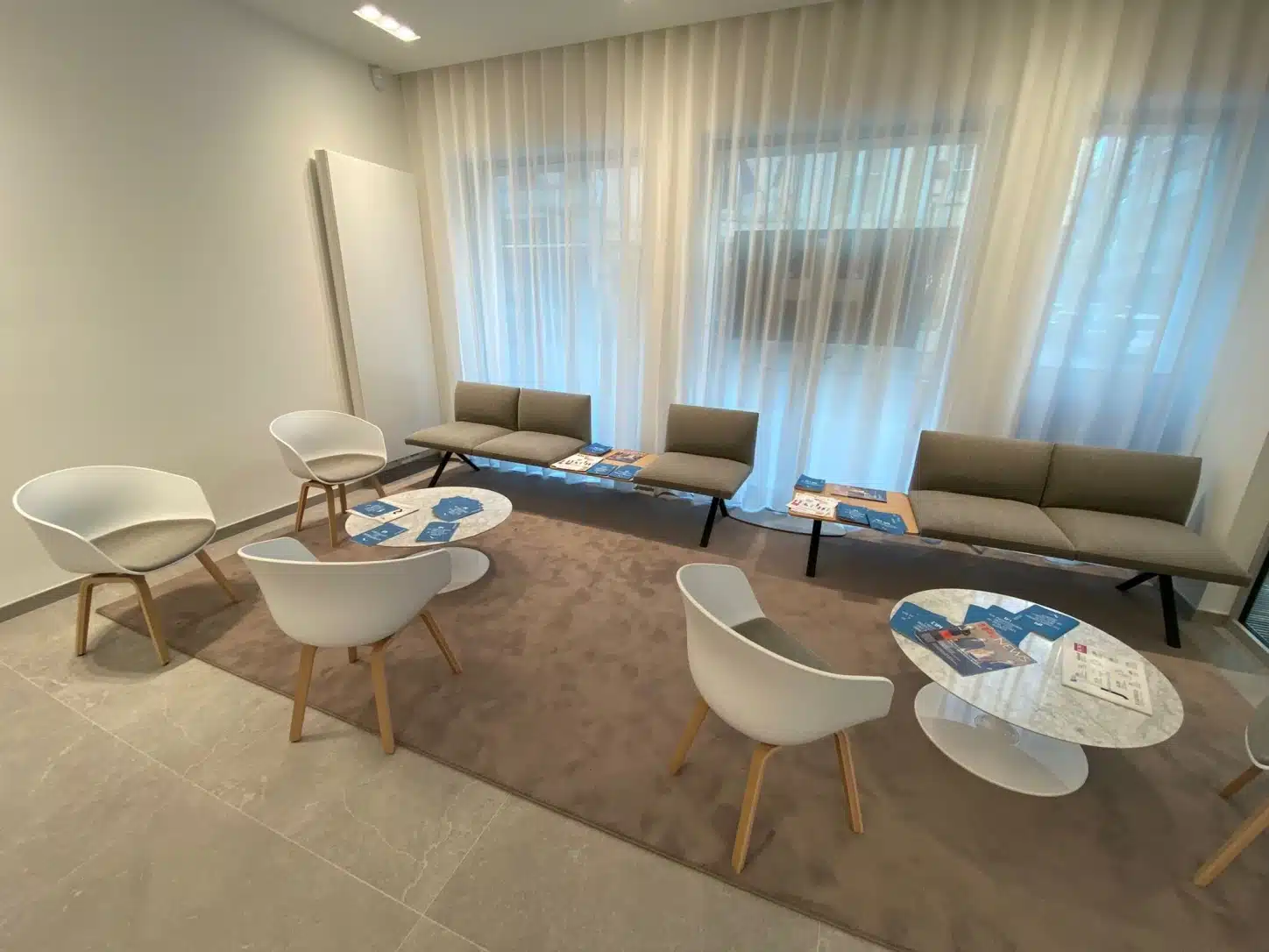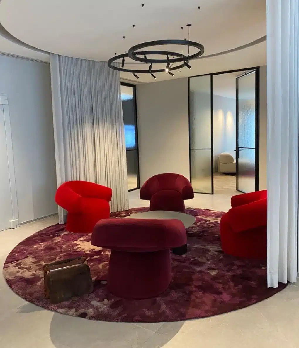Het meubilair in de Belfius Private kantoren is niet alleen comfortabel en kwalitatief, maar ook doordacht gekozen op basis van de merkidentiteit van Belfius. We voorzien zachte, afgeronde zetels in rijke stoffen in een combinatie van het herkenbare Belfius-rood met bijpassende schakeringen en diepe zwarte accenten. Die kleurencombinatie sluit perfect aan bij de huisstijl, en straalt tegelijk warmte en klasse uit. De materialen zijn tactiel en uitnodigend. Je voelt dat hier over nagedacht is: klanten moeten zich welkom voelen, op hun gemak, en met vertrouwen ontvangen worden. De inrichting draagt daar zichtbaar en onzichtbaar aan bij.