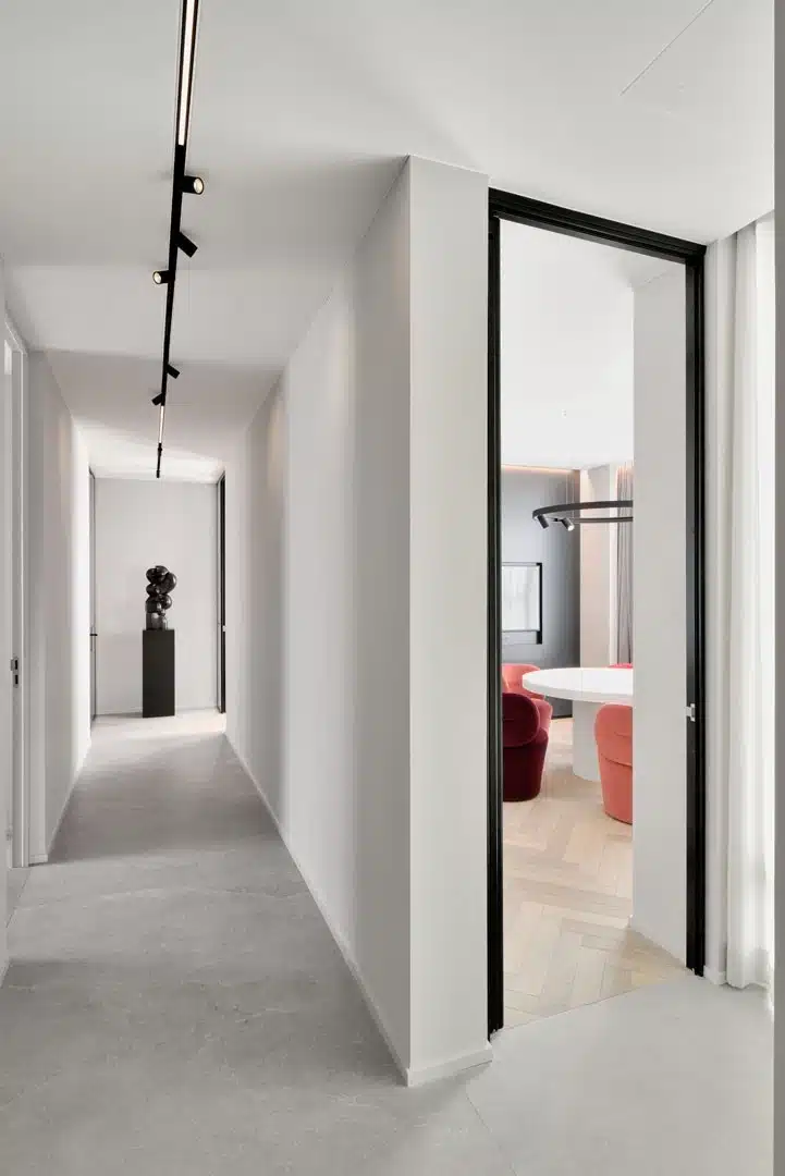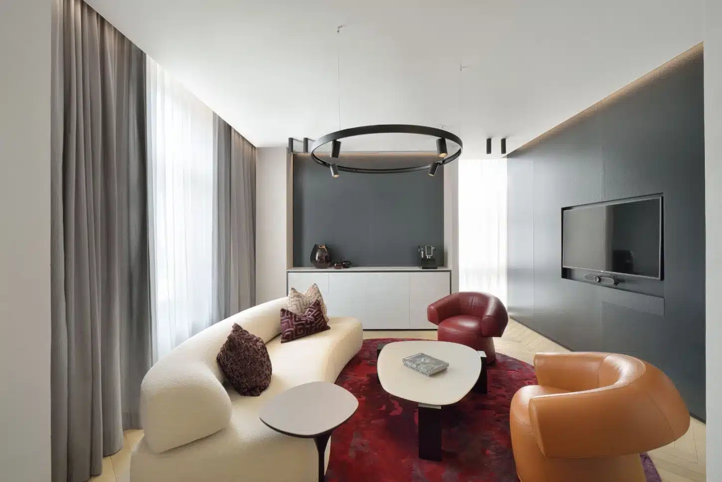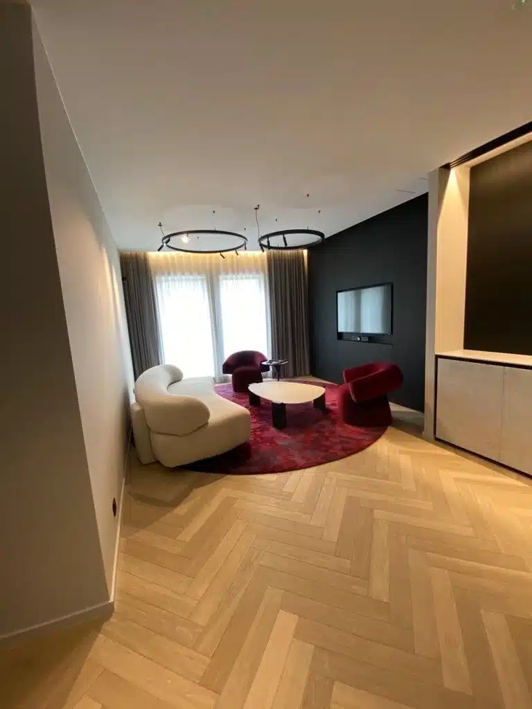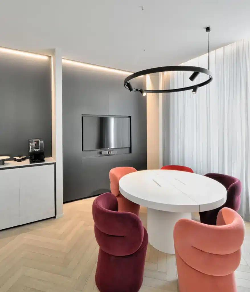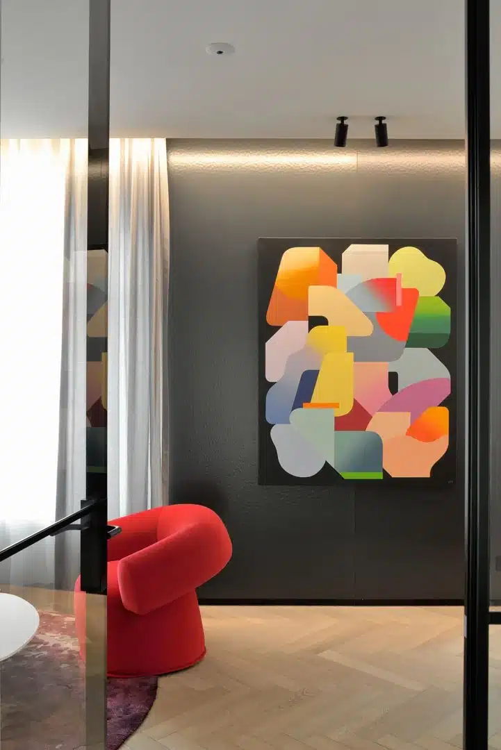 Het meubilair in de Belfius Private kantoren is niet alleen comfortabel en kwalitatief, maar ook doordacht gekozen op basis van de merkidentiteit van Belfius. We voorzien zachte, afgeronde zetels in rijke stoffen in een combinatie van het herkenbare Belfius-rood met bijpassende schakeringen en diepe zwarte accenten. Die kleurencombinatie sluit perfect aan bij de huisstijl, en straalt tegelijk warmte en klasse uit. De materialen zijn tactiel en uitnodigend. Je voelt dat hier over nagedacht is: klanten moeten zich welkom voelen, op hun gemak, en met vertrouwen ontvangen worden. De inrichting draagt daar zichtbaar en onzichtbaar aan bij.