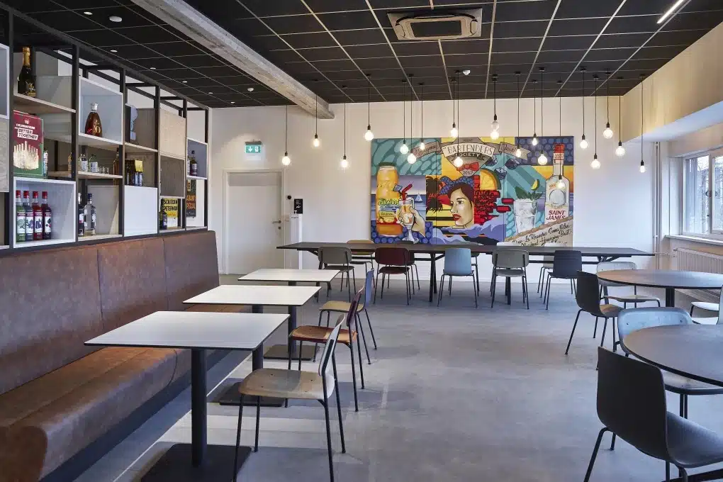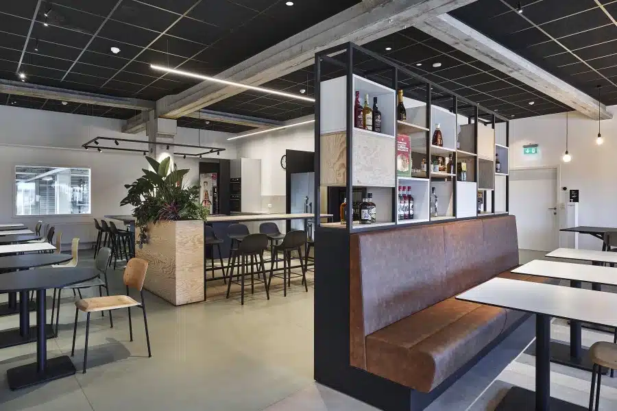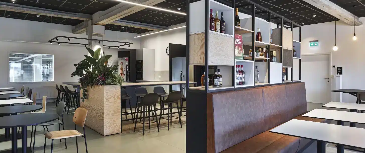 De gezamenlijke eetruimte vervangt twee afzonderlijke ‘koele refters’, zoals Michel ze noemt. “Een bewuste keuze om de groepsgeest te verhogen. Het brasseriegevoel moedigt aan om een praatje te maken, waardoor onze medewerkers elkaar nu al beter kennen.”