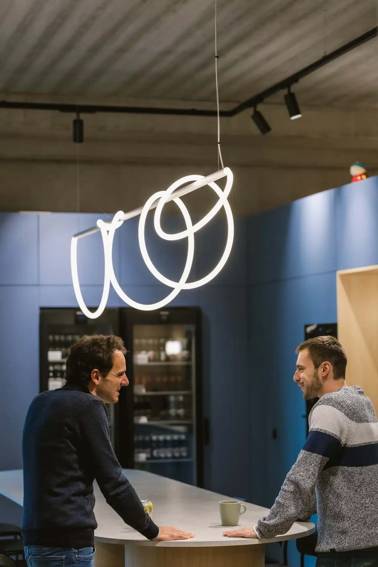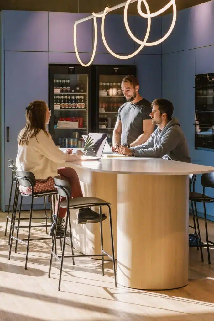 Lunchen aan een lange tafel met collega’s of een informeel gesprek bij een kop koffie? De bistro van Cronos aan de Leie speelt een sleutelrol in de sociale dynamiek op kantoor. De mix van verschillende zitopstellingen maakt het gemakkelijk om nieuwe mensen te ontmoeten of juist even terug te trekken voor een rustig gesprek. Dit versterkt niet alleen de collegiale band, maar draagt ook bij aan een prettige en inclusieve werkomgeving.