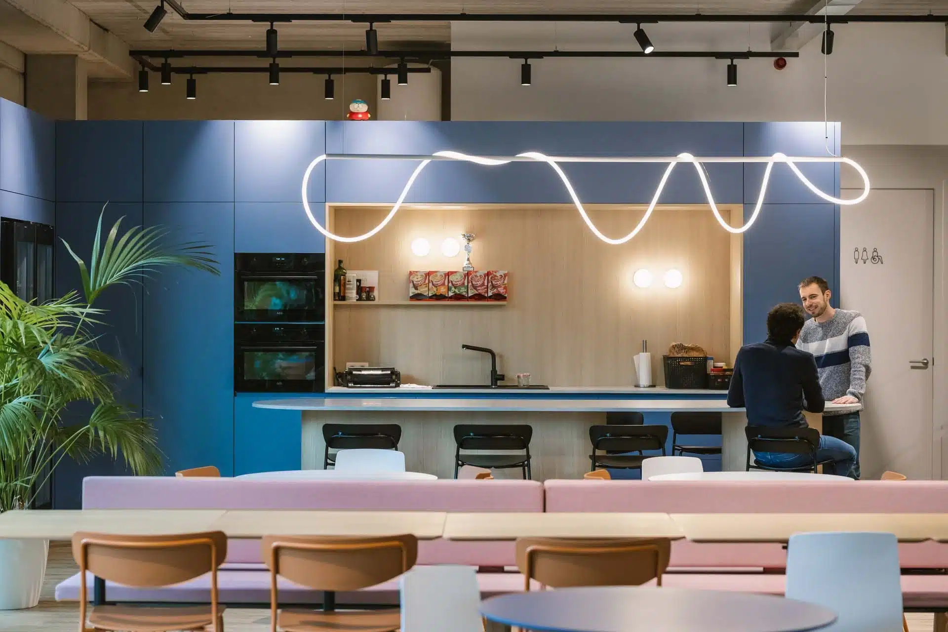 Bij binnenkomst valt meteen de harmonieuze balans tussen openheid en geborgenheid op. Ronde vormen en warme kleuren creëren een huiselijke sfeer, terwijl functionele elementen zoals akoestische wanden en strategisch geplaatste werkzones zorgen voor een optimale werkdynamiek. Het kantoor is niet zomaar een werkplek; het is een ruimte die inspireert en stimuleert, met unieke details zoals roze banken in de bistro en een amfitheater dat slim werd geïntegreerd.