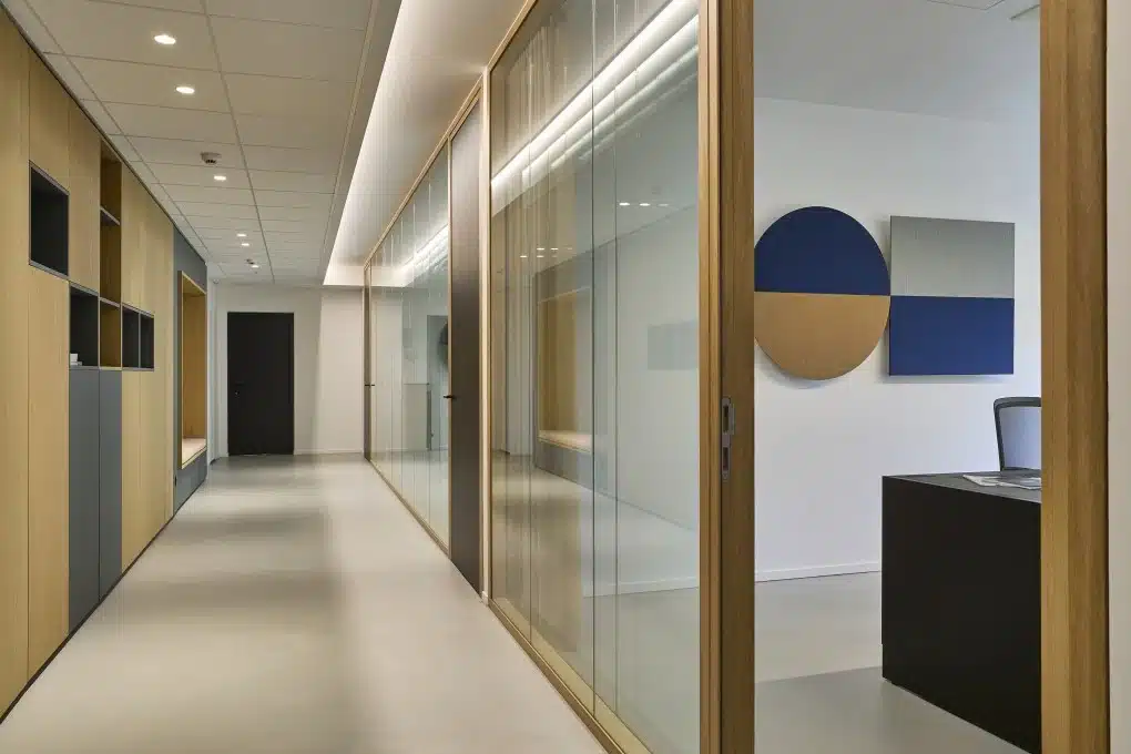 Van plannen naar praktijk! Tijdens de uitvoering hebben we nauw samengewerkt met aannemers en leveranciers om het ontwerp tot in de puntjes te realiseren. We zorgden voor de coördinatie van de structurele werken, de plaatsing van het maatwerk, de integratie van verlichting én technologische tools. Alles met één doel: een duurzaam en inspirerend kantoor waar het goed werken is.