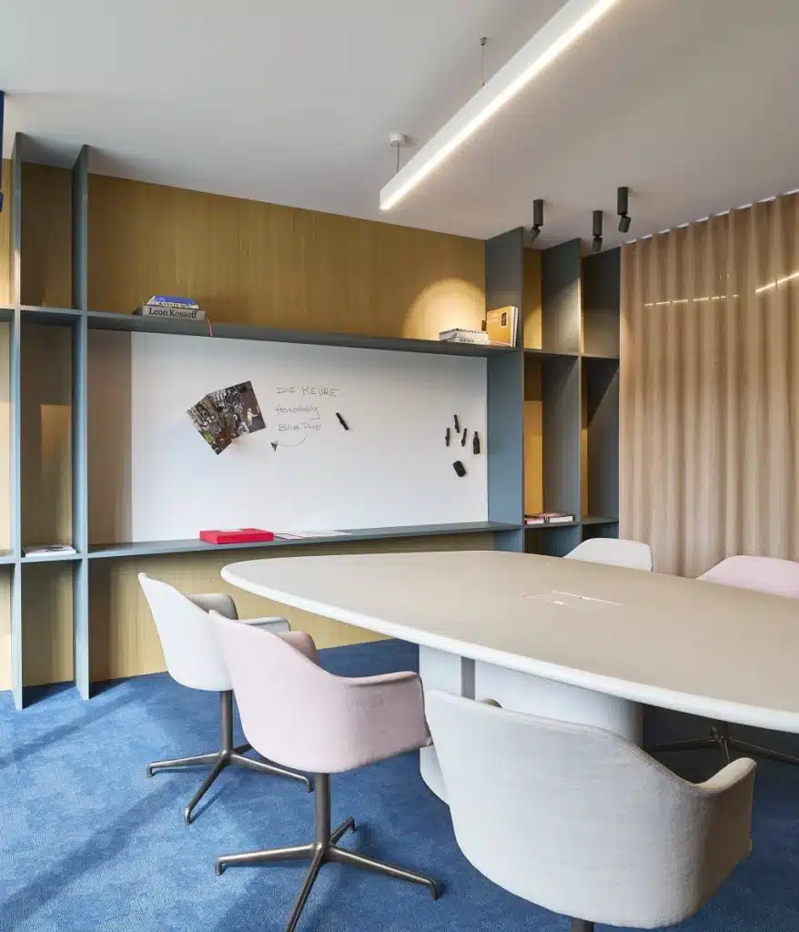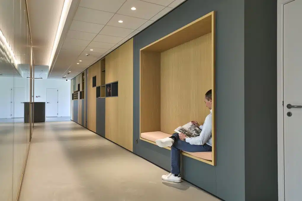 Samen met het team van Die Keure brachten we alle noden en wensen in kaart. We werkten een indelingsplan uit waarin samenwerking, focus en gastvrijheid centraal staan. Elke ruimte kreeg een duidelijke functie, met slimme zones voor overleg, concentratie én ontspanning. Zo zorgen we voor een natuurlijke flow doorheen het kantoor.