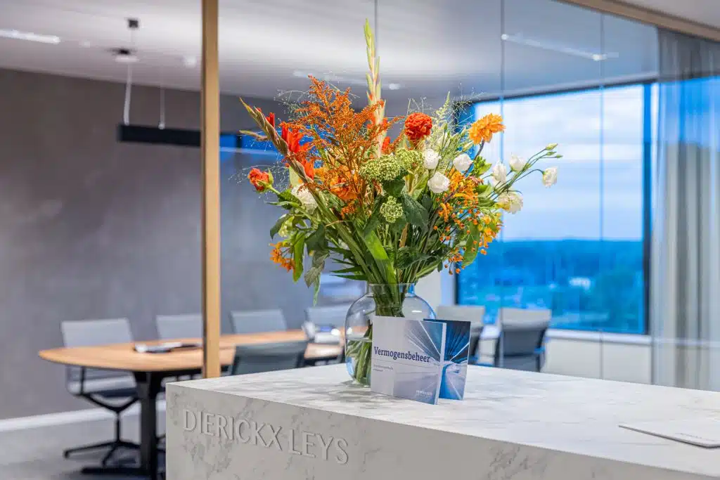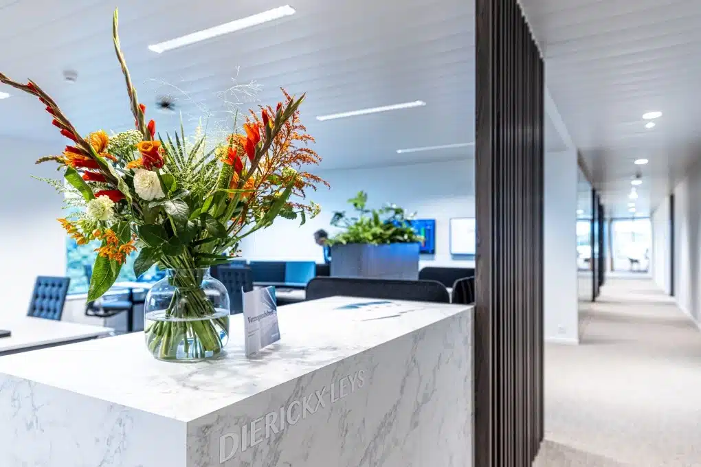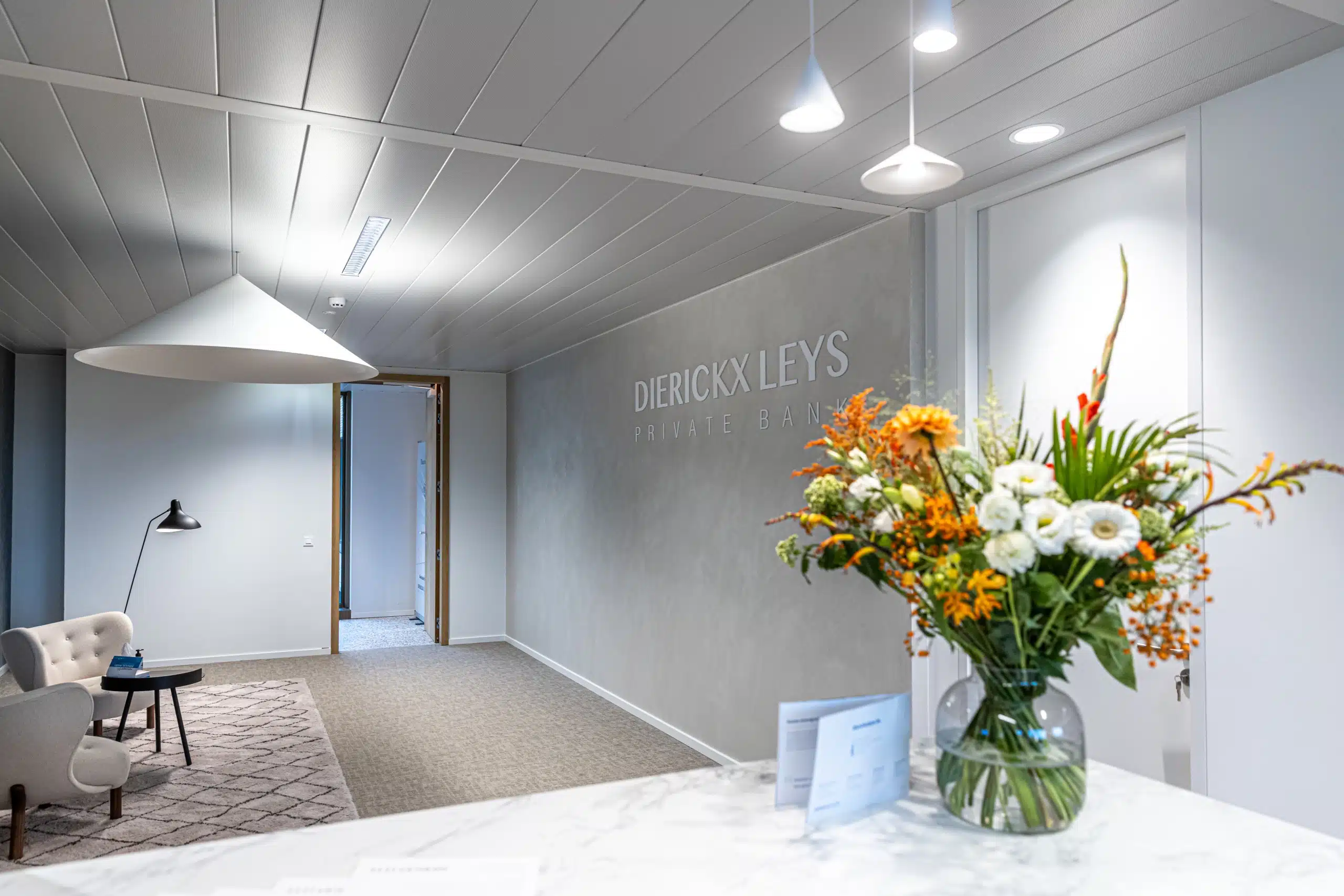 Een eerste indruk is blijvend. Dat geldt ook voor je kantoor. De stijlvolle inkomhal van private bank Dierickx Leys wekt alvast vertrouwen op. De gezellige zithoek, elegante natuursteen en strakke kleuren – allemaal kozen we ze bewust uit. Ze stralen de persoonlijkheid uit van de private bank, en die is net een tikkeltje anders dan bij concullega’s. Met een warm welkom helpen we hen alvast de eerste stap te zetten naar langdurige klantenrelaties, en die visie rendeert.