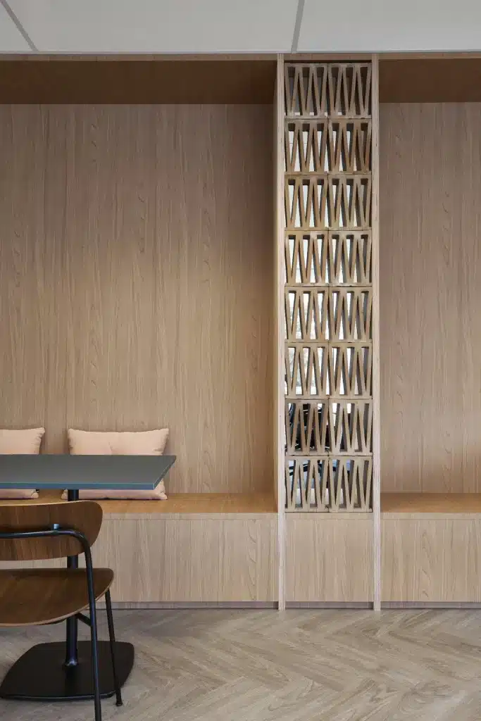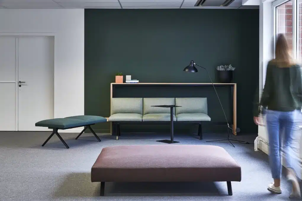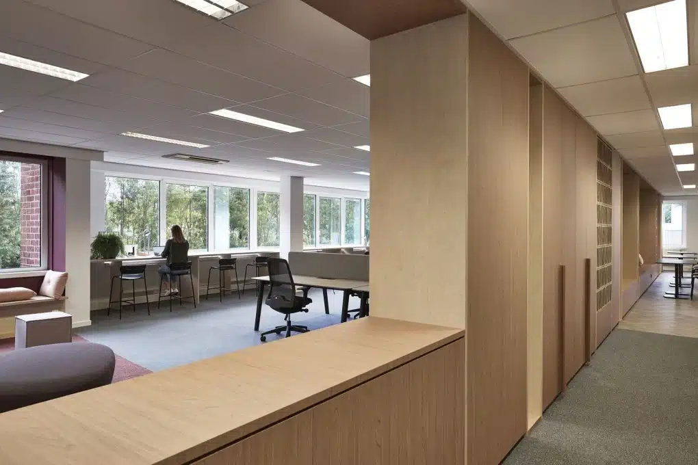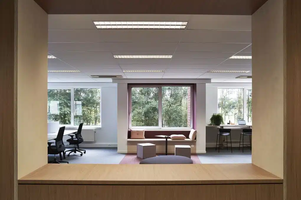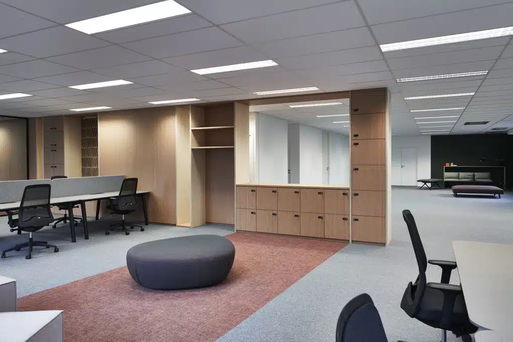 - Een maatwerkwand die verschillende functies integreert, nl. zitgelegenheid, lockers, vestiaire en copyhoek;