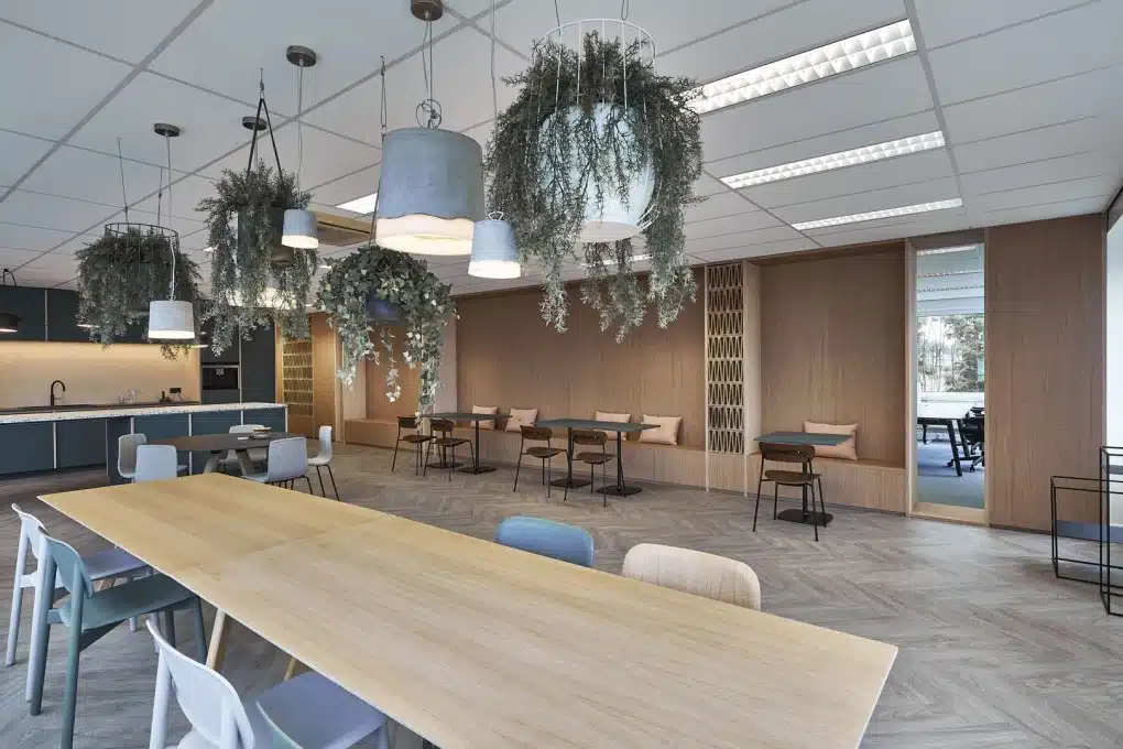 - Een open ruimte met 20 flexwerkplekken die dankzij de organische vormen niet aan een clean kantoor doet denken;