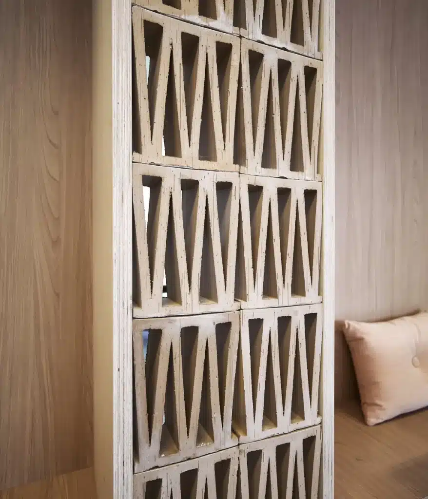 De open en transparante ruimtes zijn een terugkerend element doorheen de volledige inrichting. Maaike: “Er is een lange functionele maatwerkwand, maar het oog wil natuurlijk ook wat. Zo zijn er verschillende stroken waar we met een decoratieve baksteen hebben gewerkt. Zo krijg je doorkijk naar de andere kant van de ruimte en werd het geheel niet te zwaar. Bij het binnenkomen wordt de nieuwsgierigheid van de bezoeker meteen gewekt om de ruimte achter de wand te ontdekken. Er werd ook een grote opening voorzien om het zicht op de groene omgeving van een kader te voorzien.”