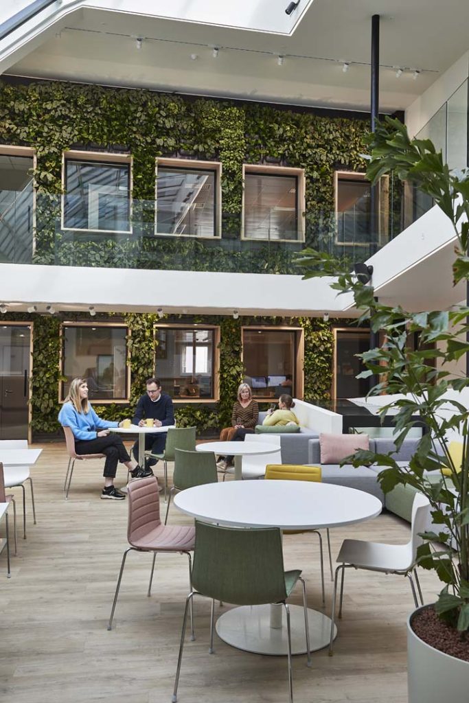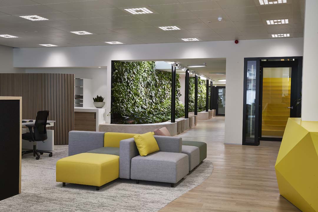 Van afgeronde vormen tot onderhoudsvriendelijke materialen: alles draagt bij aan een kantoor dat niet alleen praktisch is, maar ook aangenaam en herkenbaar. Groenwanden en losse planten versterken het gevoel van huiselijkheid, terwijl kleuraccenten en textuur zorgen voor een warme uitstraling.