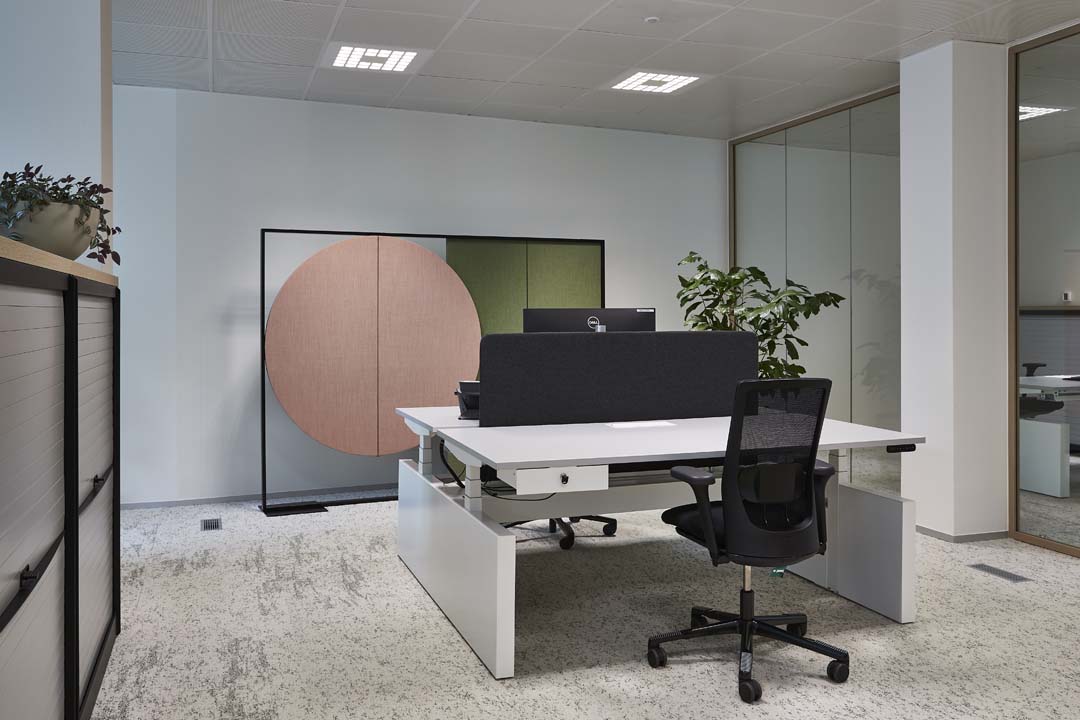 De inrichting is afgestemd op het principe van het nieuwe werken. Zit/sta-bureaus, informele vergaderhoeken en werkboxen creëren variatie en bewegingsvrijheid. In de directievergaderzaal staat een grote tafel met Fenix-blad en een houten sokkel die alle technieken elegant verbergt. Elk element is ontworpen om functionaliteit en esthetiek te combineren.