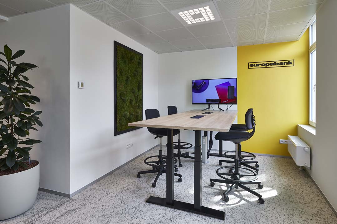 Het gebouw combineert historische charme met moderne efficiëntie. Het atrium, badend in daglicht en omringd door groen, vormt het hart van de werkomgeving. Rondom deze centrale plek vind je kantoren, vergaderzalen en werkzones die allemaal dezelfde sfeer ademen: licht, tactiel en uitnodigend. Pasteltinten, vooral zachte groenen, brengen rust. Geel, de huisstijlkleur van Europabank, zorgt voor subtiele accenten in details zoals handgrepen en decoratie.