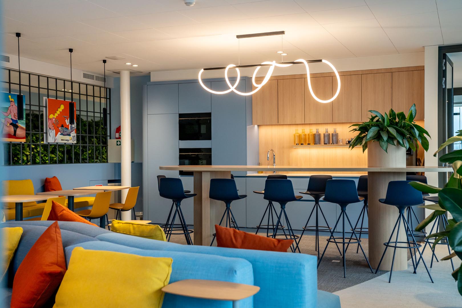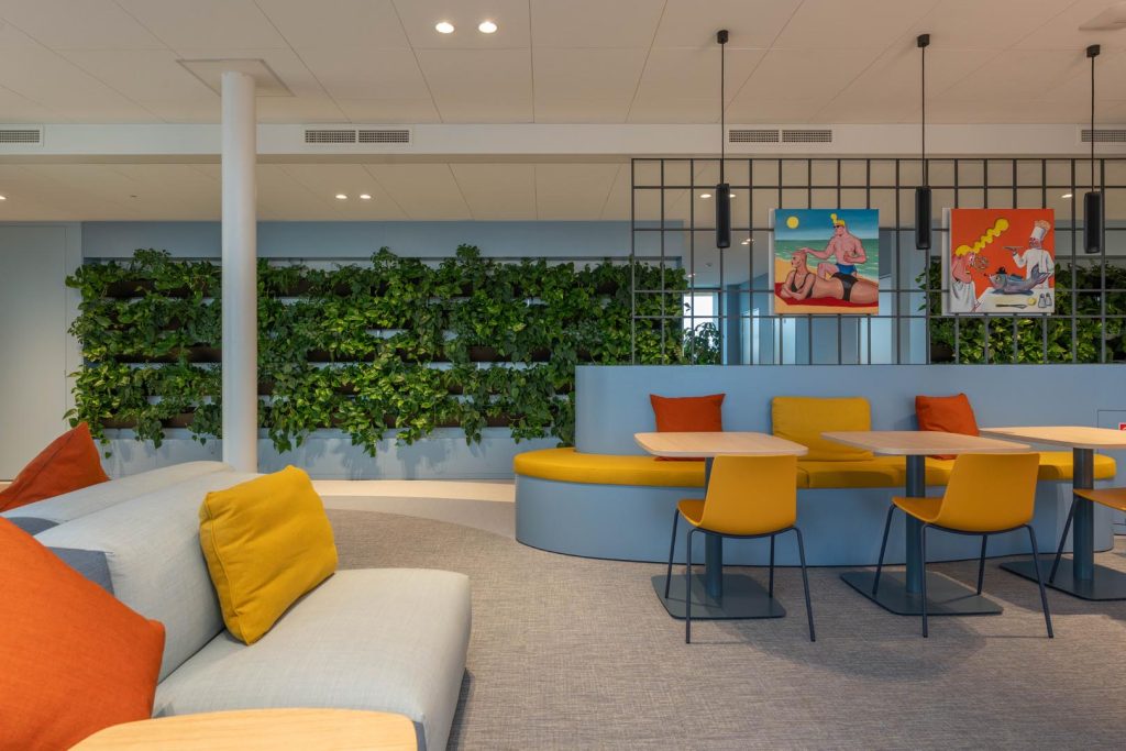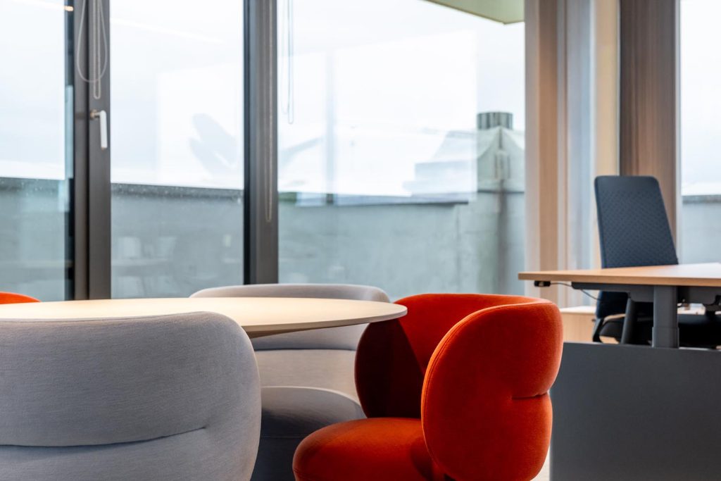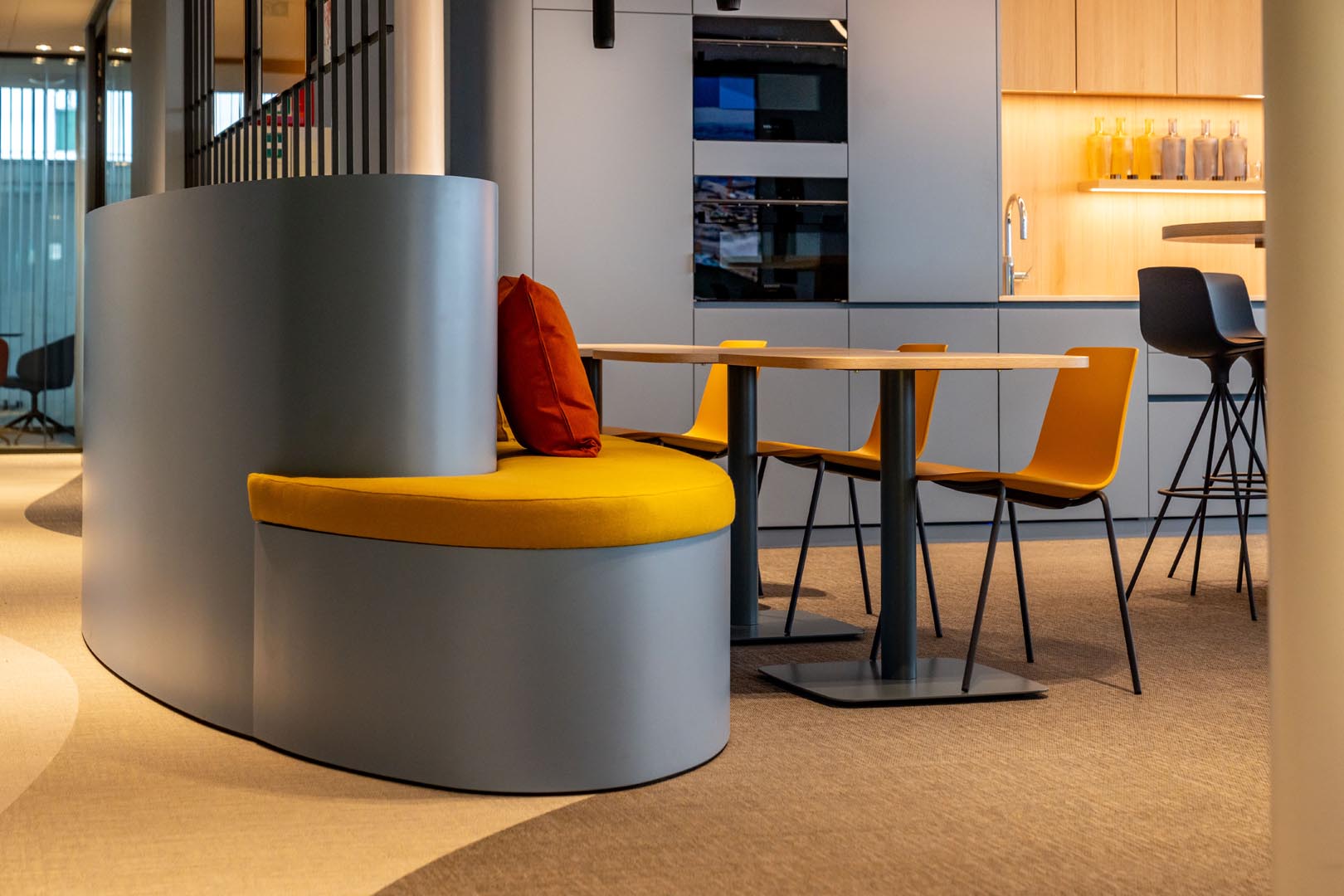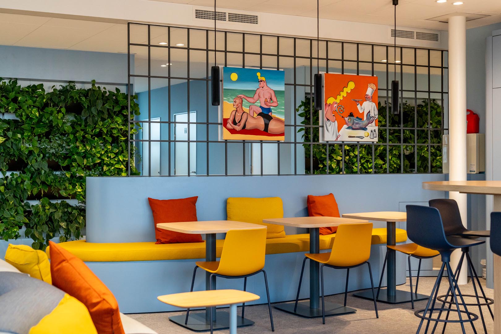 In de werkzones bleven we bewust zachter en meer neutraal zodat je hoofd tot rust komt. De uitgesproken kleuren zitten vooral op plekken waar mensen samenkomen.