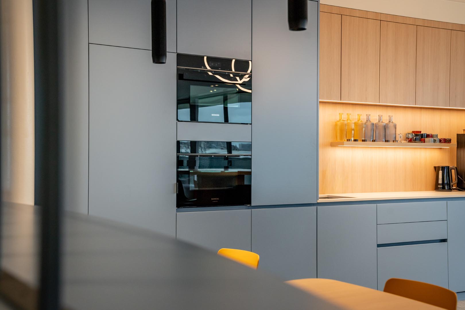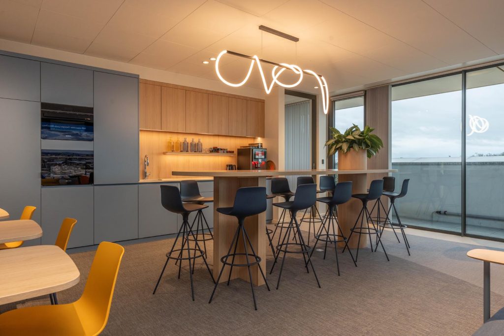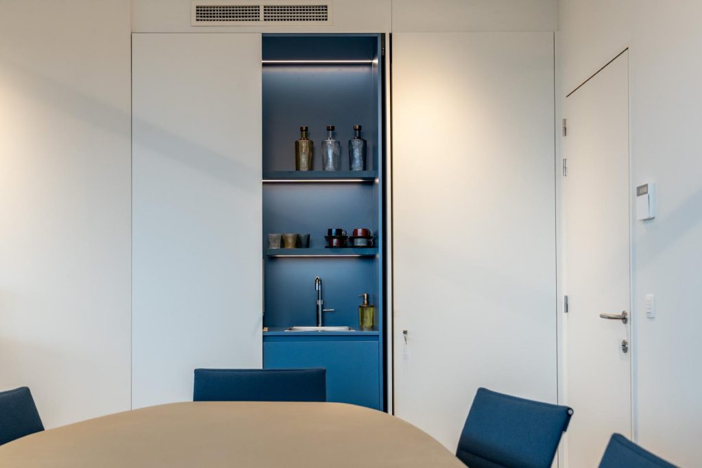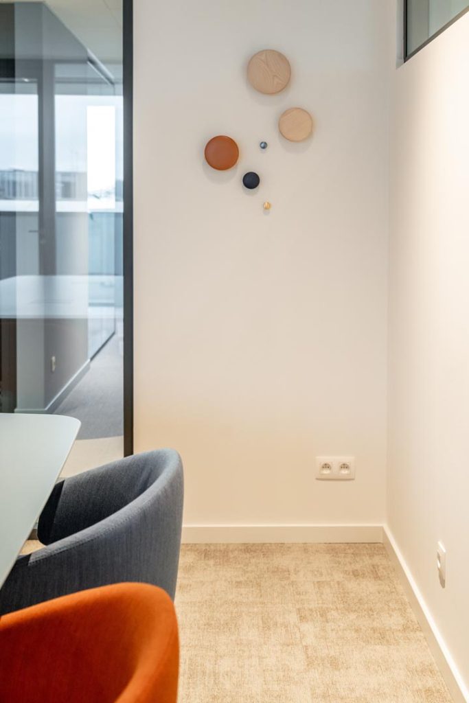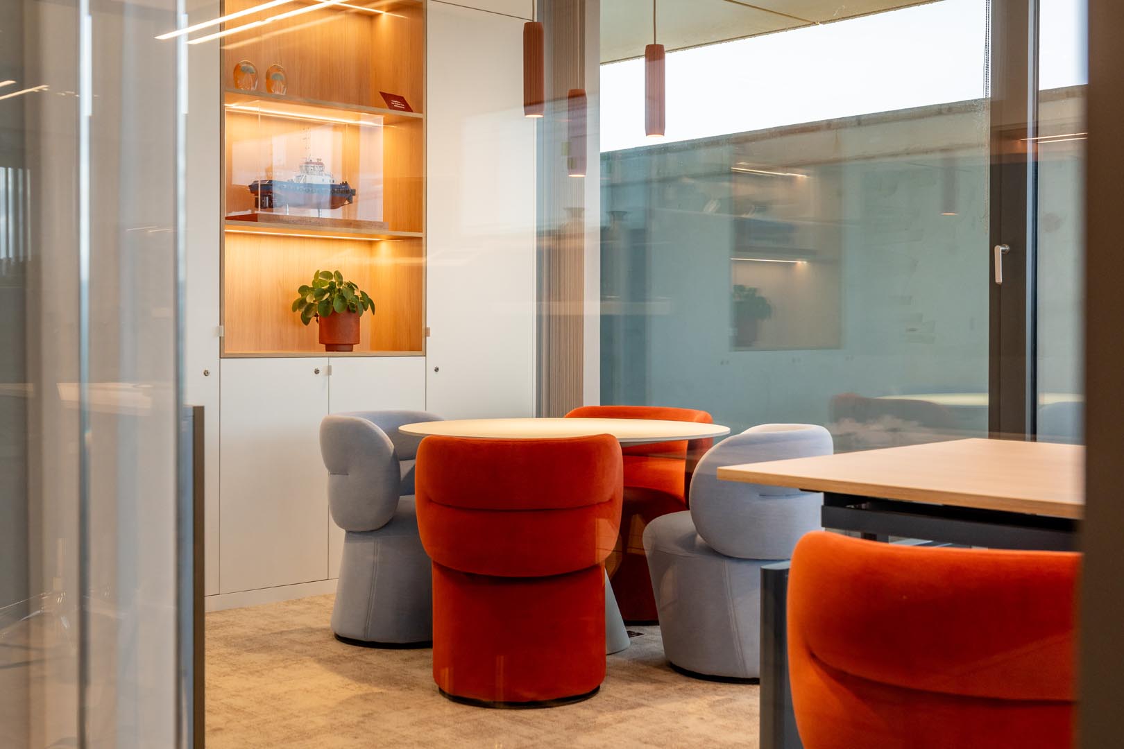 Het kantoor voelt tegelijk professioneel, warm en typisch Port Oostende. Je merkt de zee niet alleen in de kleuren en lijnen, maar ook in de manier waarop je door de ruimte beweegt. Het loopt vanzelf, zoals water dat zijn weg vindt.