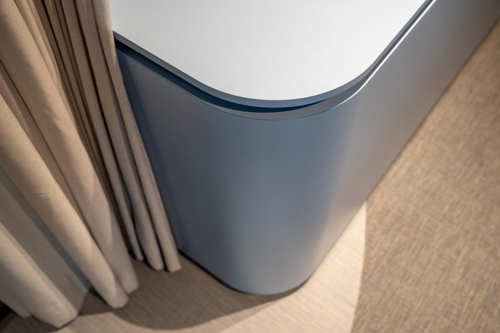 In de renders kwam het kantoor echt tot leven. De blauwe tinten, het roestkleurige accent, het maatwerk en de afgeronde vormen kregen allemaal hun plek. Het werd meteen duidelijk hoe het geheel de rust van de zee naar binnen bracht, zonder het monumentale karakter te verliezen.