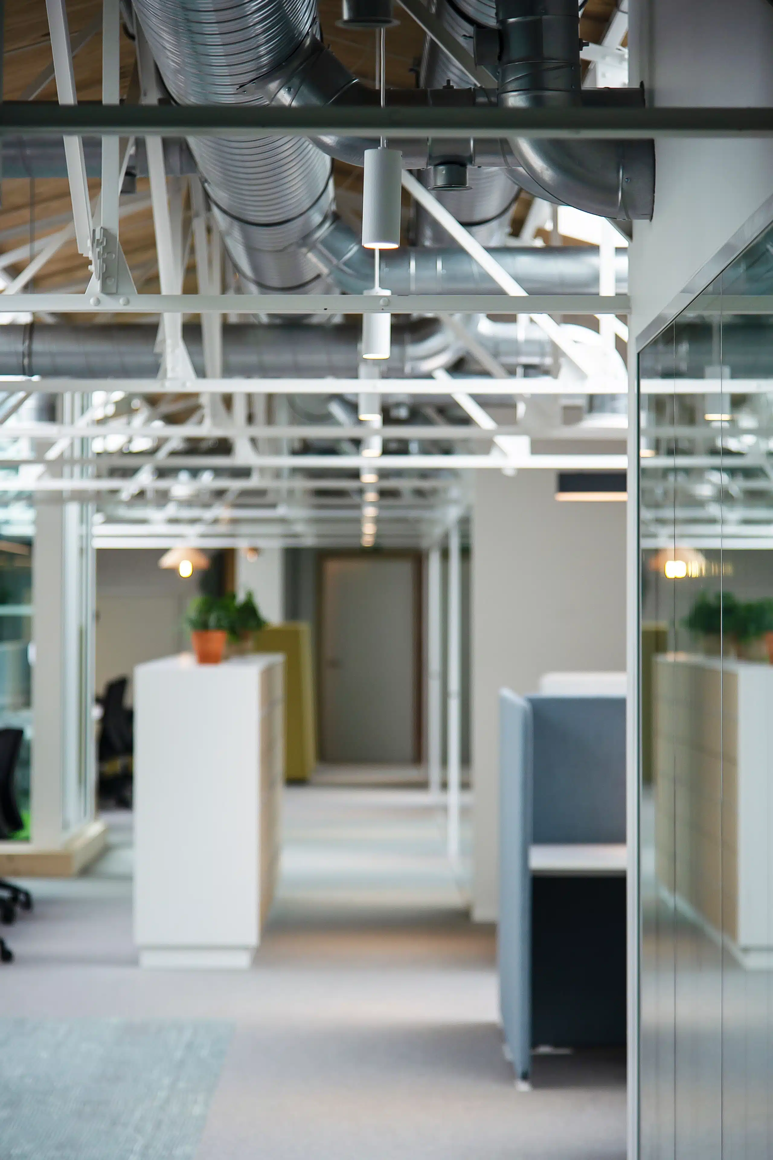 Hoera, dit vereist een totaalaanpak! De indeling moet samenwerking stimuleren met een overzichtelijke mix van gesloten en open ruimtes, waarbij beide maximaal toegang hebben tot daglicht en zicht naar buiten. Houten rekken, lockers en whiteboards verdelen de grote, open ruimte in aparte sectoren. Met tapijten in verschillende kleuren en texturen krijgen deze werkzones elk een eigen uitstraling en karakter. Bovendien dragen tapijten ook bij aan een betere akoestiek, net zoals de houten meubels, de hogere objecten en de gordijnen in sommige vergaderruimtes.