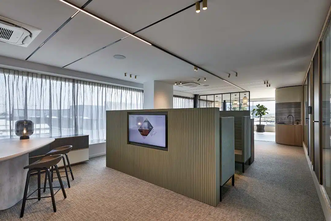 Een modern kantoor bestaat uit meerdere zones: stille ruimtes om te focussen, gezellige hoeken voor informele babbels en open zones voor samenwerking. Zo kan iedereen op elk moment de juiste flexibele werkruimte kiezen voor de taak die voorligt.