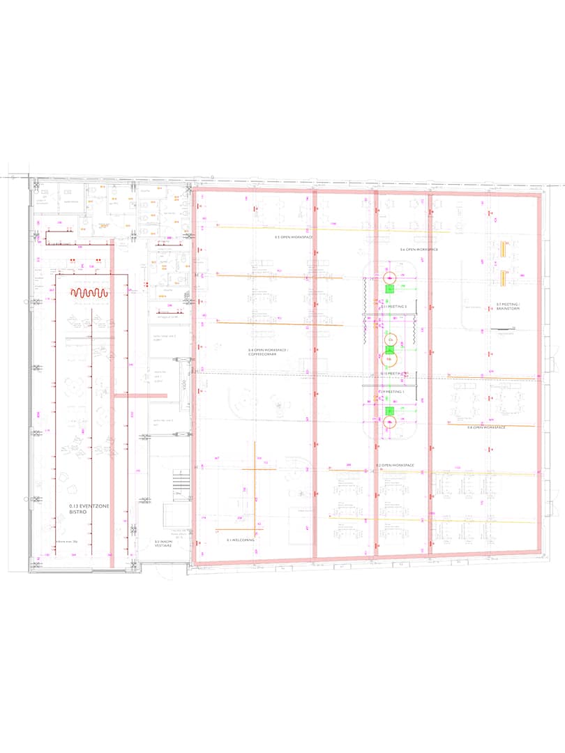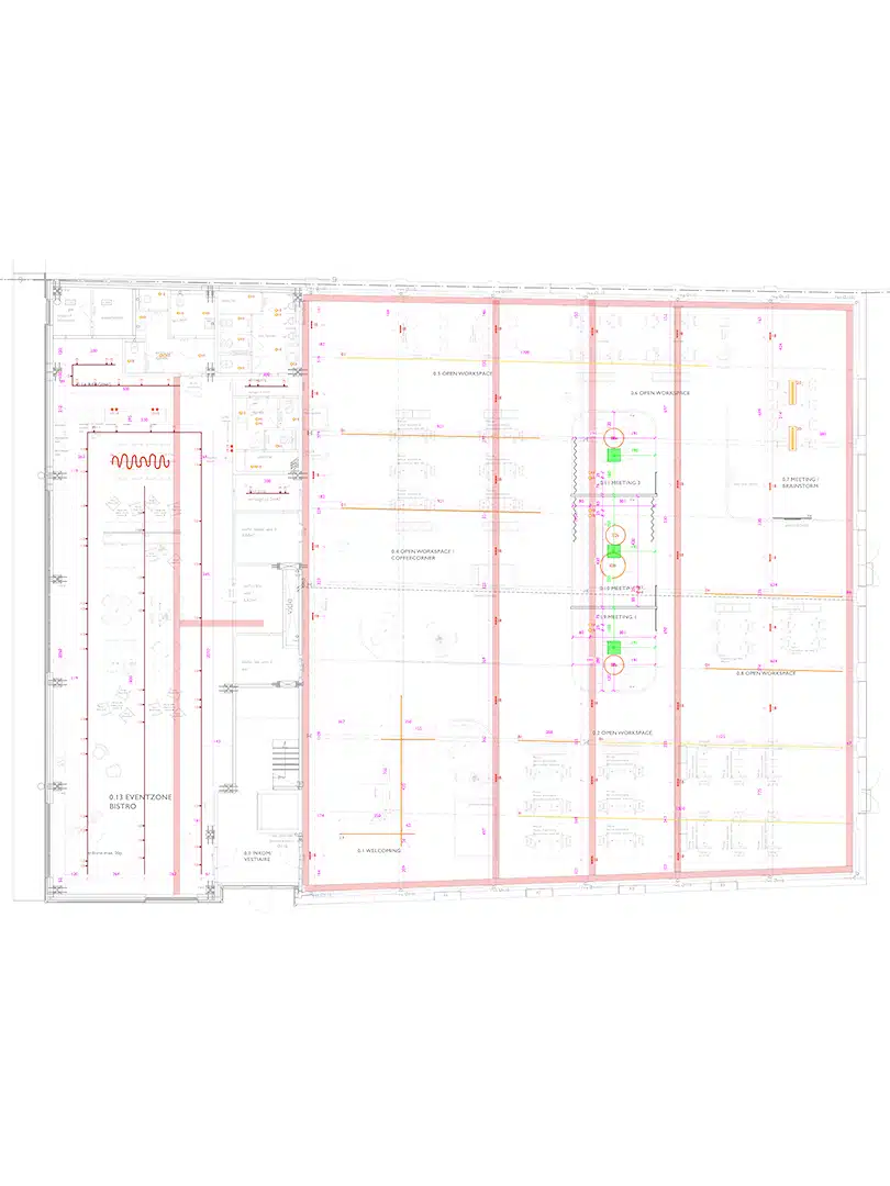 We starten met een grondige behoefteanalyse: wie werkt waar, hoe, en waarom? Via interviews en werksessies brengen we werkstijlen, ruimtelijke noden en de gewenste sfeer in kaart. We analyseren het gebouw en bestaande elementen die hergebruikt kunnen worden. Op basis van deze inzichten ontwikkelen we eerste inplantingen waarin functie, flow en rustpunten in balans zijn.